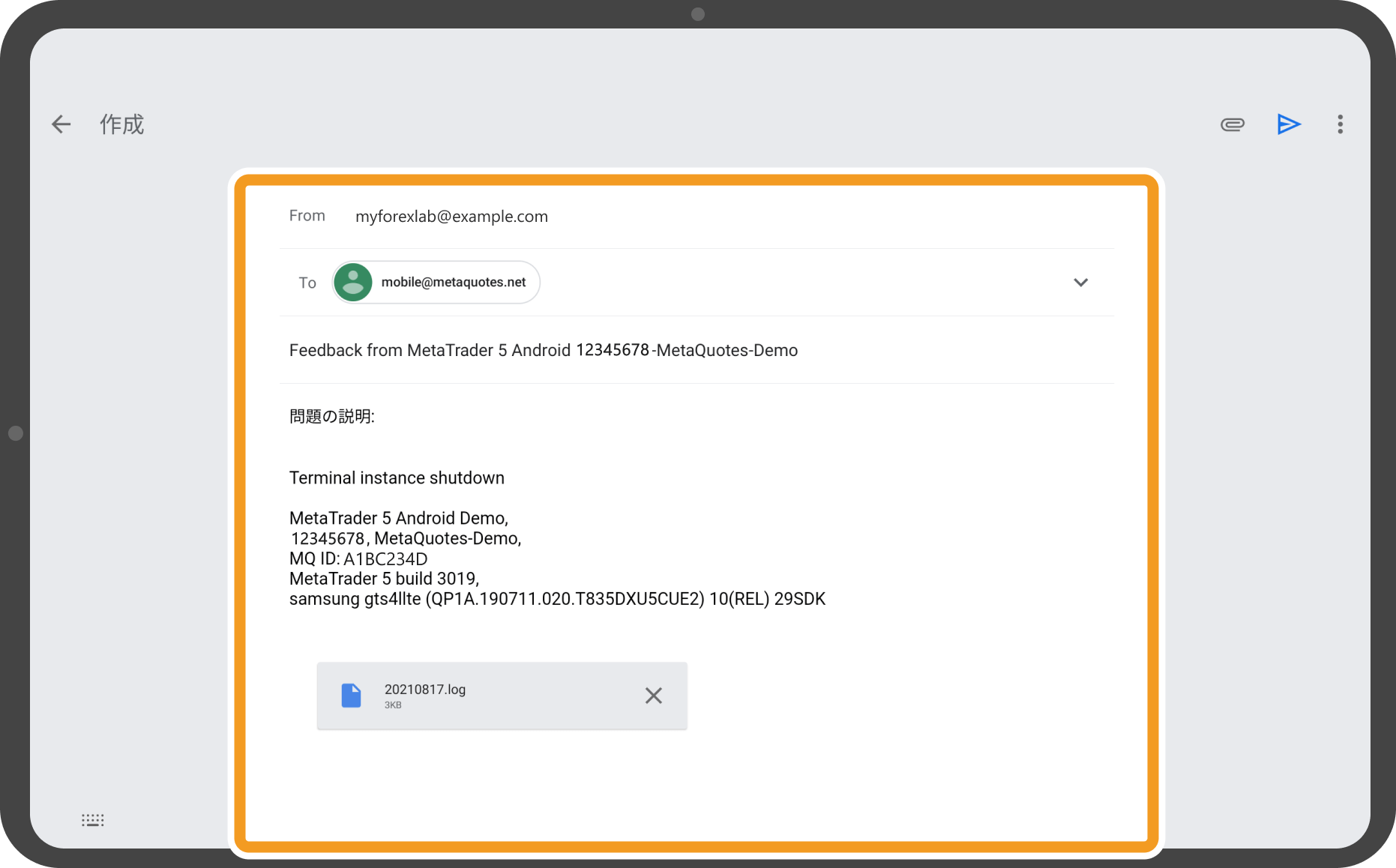 Here we'll look over the steps on how to check your action logs and attach the log file to an email on MetaTrader4 (MT4) / MetaTrader5 (MT5) app for Android and iOS mobile devices. Here you can check all of your actions on MT4/MT5 including boot, server connection, data transmission, details of each order, and more. If an error occurs, you may be able to check your logs to find the cause. Furthermore, when you ask your broker to look into your trades, you may be asked to submit your logs.