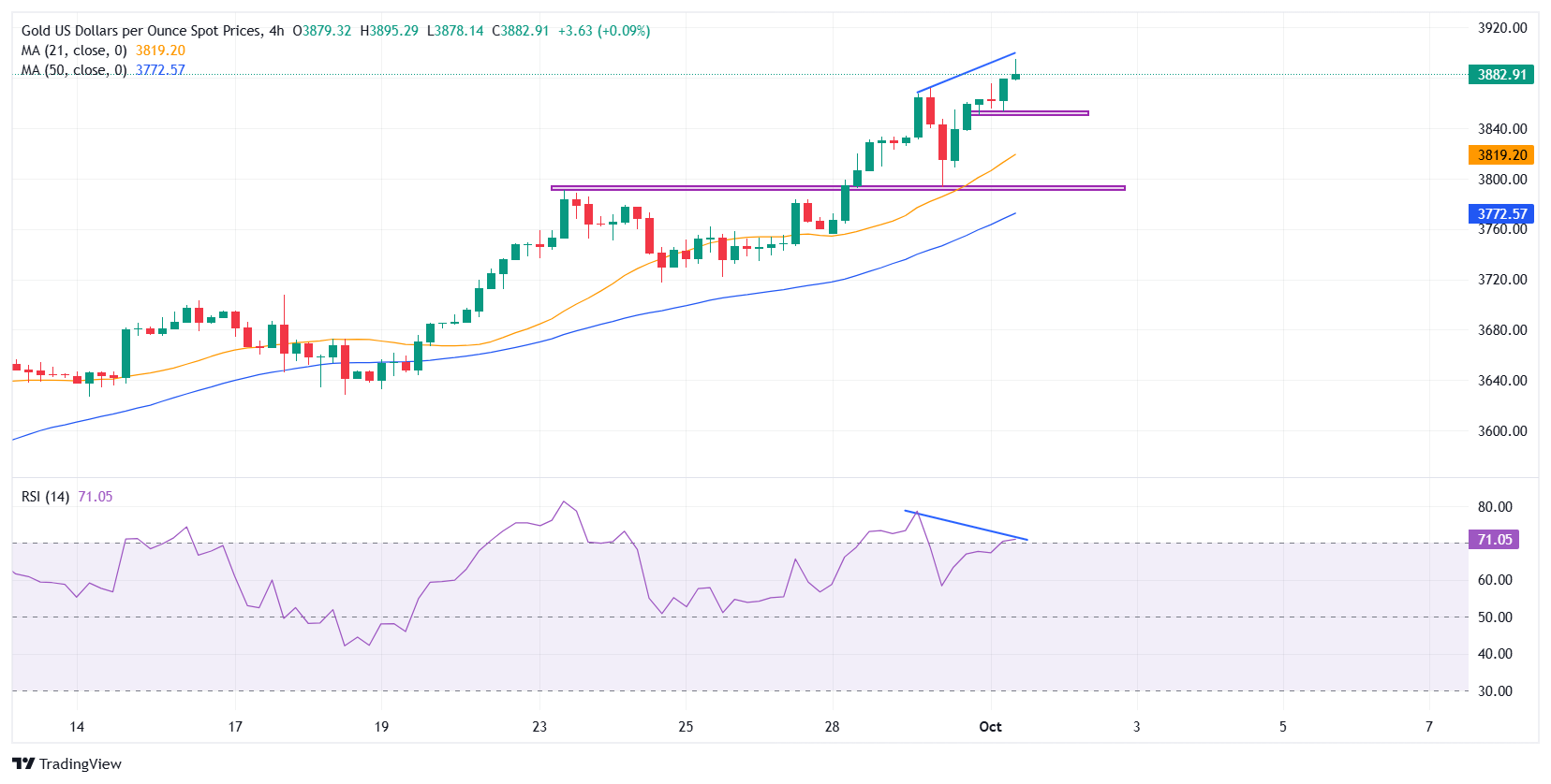 Gold (XAU/USD) soars to yet another record high on Wednesday, extending its relentless climb as the United States (US) government shutdown fuels safe-haven demand. At the time of writing, XAU/USD is trading around $3,883 during the European session, after peaking at a fresh all-time high near $3,895, up nearly 0.65% on the day.