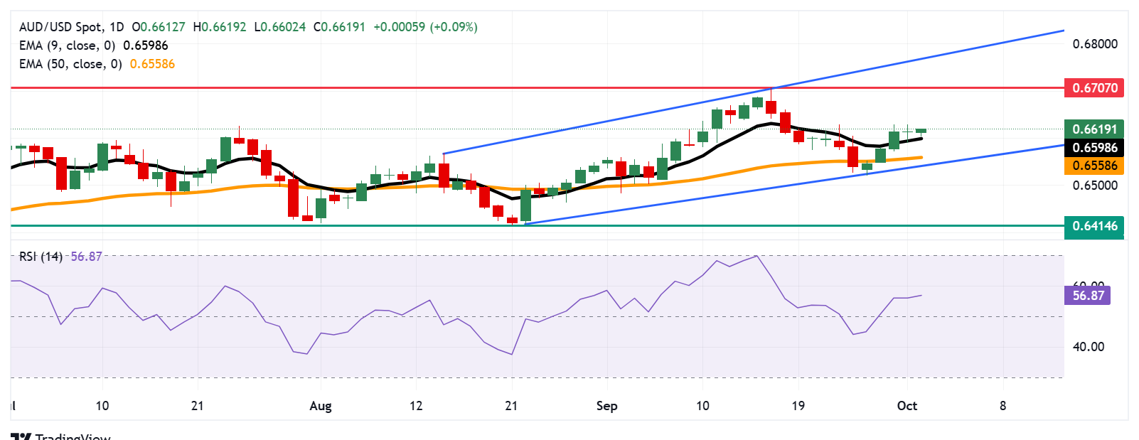 The AUD/USD pair is trading around 0.6620 on Thursday. Technical analysis on the daily chart shows that the pair remains within the ascending channel, indicating a prevailing bullish bias. Additionally, the 14-day Relative Strength Index (RSI) is positioned above the 50 level, strengthening the bullish bias.