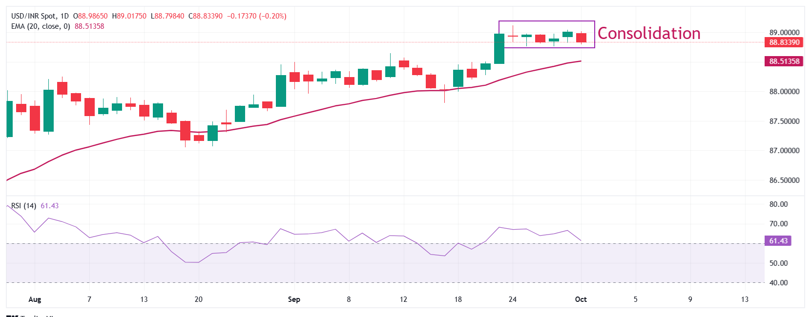 USD/INR has been trading sideways after posting a fresh all-time high near 89.10 last week. The near-term trend of the pair remains bullish as the 20-day Exponential Moving Average (EMA) slopes higher around 88.50.