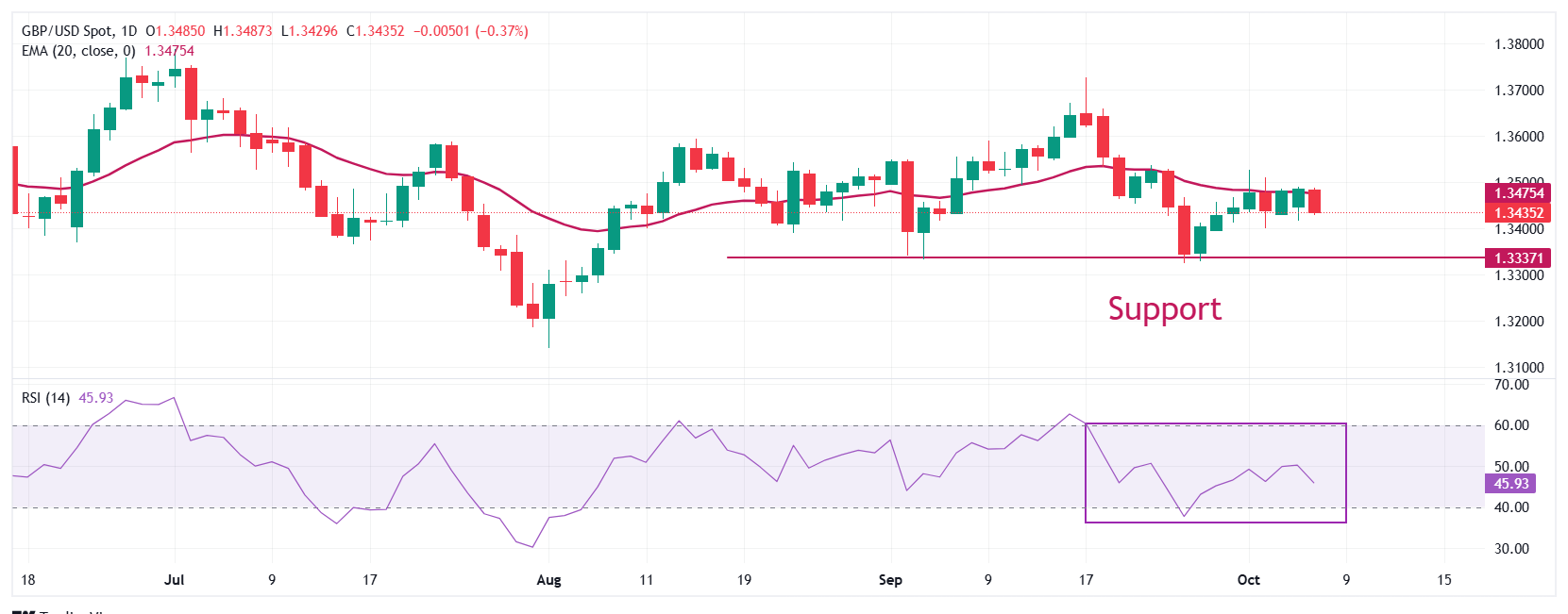 The Pound Sterling slides to near 1.3440 against the US Dollar on Tuesday. The GBP/USD pair struggles to return above the 20-day Exponential Moving Average (EMA), which trades around 1.3475.