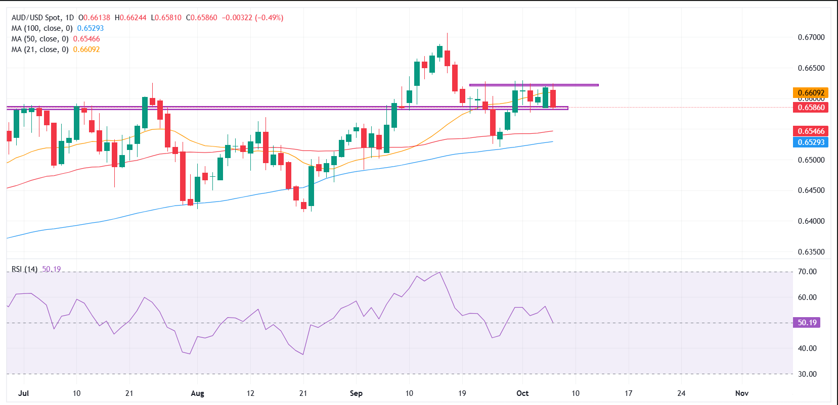 The Relative Strength Index (RSI) on the daily chart is hovering near 51, indicating neither overbought nor oversold conditions. While the US Dollar's recent strength could prove short-lived amid the prolonged United States (US) government shutdown and rising expectations of further interest rate cuts by the Federal Reserve (Fed), any pullback in the Greenback is likely to keep downside in AUD/USD contained. At the same time, the Reserve Bank of Australia's (RBA) cautious stance on further monetary policy easing provides an additional layer of support.