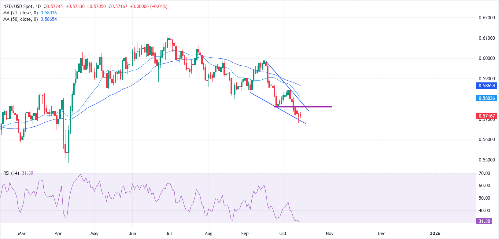 On the upside, initial resistance is seen near 0.5750, a former support level that has now turned into resistance, aligning with the upper boundary of the falling wedge. A sustained move above this zone could signal the start of a corrective rebound, with further upside targets at the 21-day Simple Moving Average (SMA) around 0.5800 and the 50-day SMA near 0.5865.