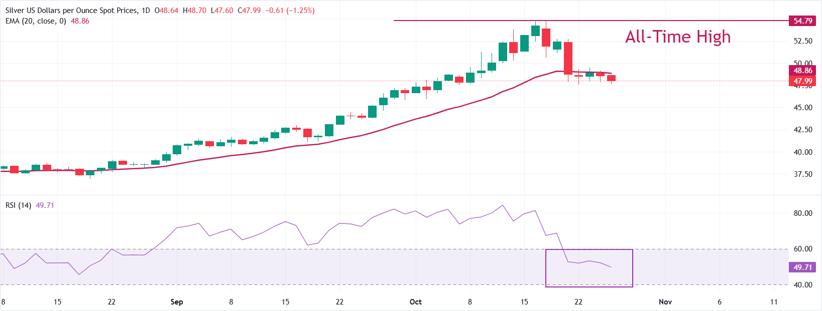 Silver price retraces from the all-time high of around $54.85 posted last week. The near-term trend of the precious metal has become uncertain as it struggles to return above the 20-day Exponential Moving Average (EMA), which trades around $48.86.