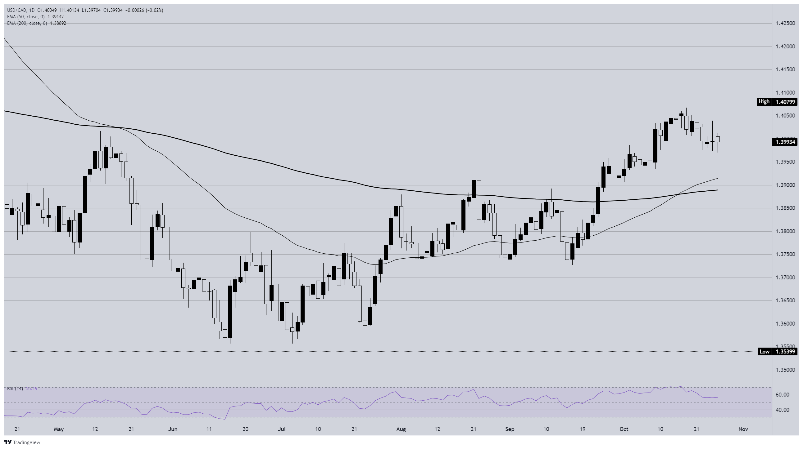 USD/CAD continues to consolidate just below the 1.4050-1.4080 resistance zone after a strong October rally. The pair remains above both the 50-day EMA (1.3914) and 200-day EMA (1.3889), maintaining a constructive short-term structure.