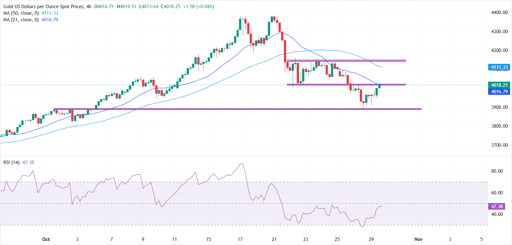 XAU/USD is attempting to stabilize above $4,000, but the rebound remains fragile. On the 4-hour chart, immediate resistance is seen in the $4,020-$4,050 zone, a former support area now reinforced by the 21-period Simple Moving Average (SMA). A decisive break above this region could open the door toward the next resistance at $4,100-$4,150, which aligns with the 50-period SMA.