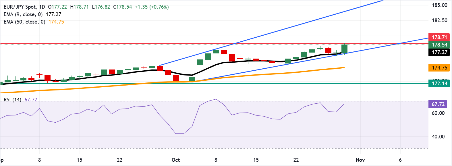 EUR/JPY gains ground after remaining flat in the previous session, trading around 178.50, near record highs, during the European hours on Thursday. The technical analysis of the daily chart suggests strengthening of a bullish bias as the currency cross has rebounded from the confluence support zone around the nine-day Exponential Moving Average (EMA) and lower boundary of the ascending channel pattern.
