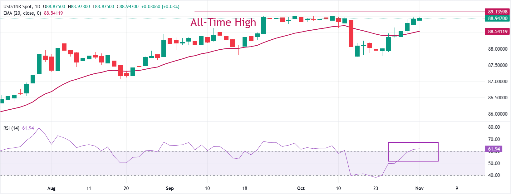 USD/INR trades firmly near over two-week high around 88.95 at the start of the week. The near-term trend of the pair remains bullish as it trades above the 20-day Exponential Moving Average (EMA), which trades around 88.54.