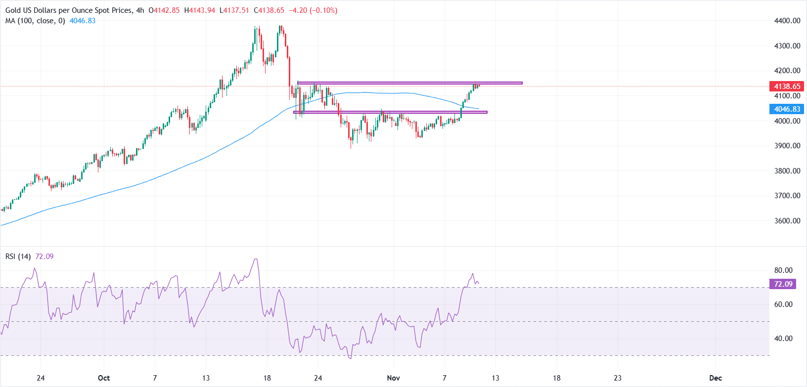 At the time of writing, XAU/USD is trading near three-week highs around $4,140, up nearly 0.7% on the day.