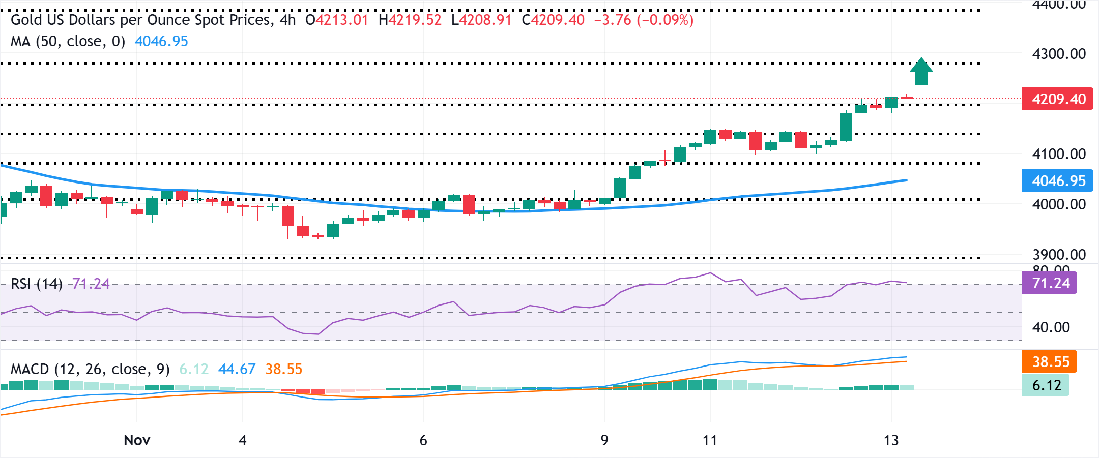 Meanwhile, the optimism led by a positive development to reopen the US federal government remains supportive of the underlying bullish sentiment across the global financial markets. This, in turn, might hold back traders from placing fresh bullish bets around the safe-haven Gold. That said, a sustained strength above the $4,200 mark, along with the supportive fundamental backdrop, favors the XAU/USD bulls. Hence, any corrective slide could be seen as a buying opportunity and is more likely to remain limited.
