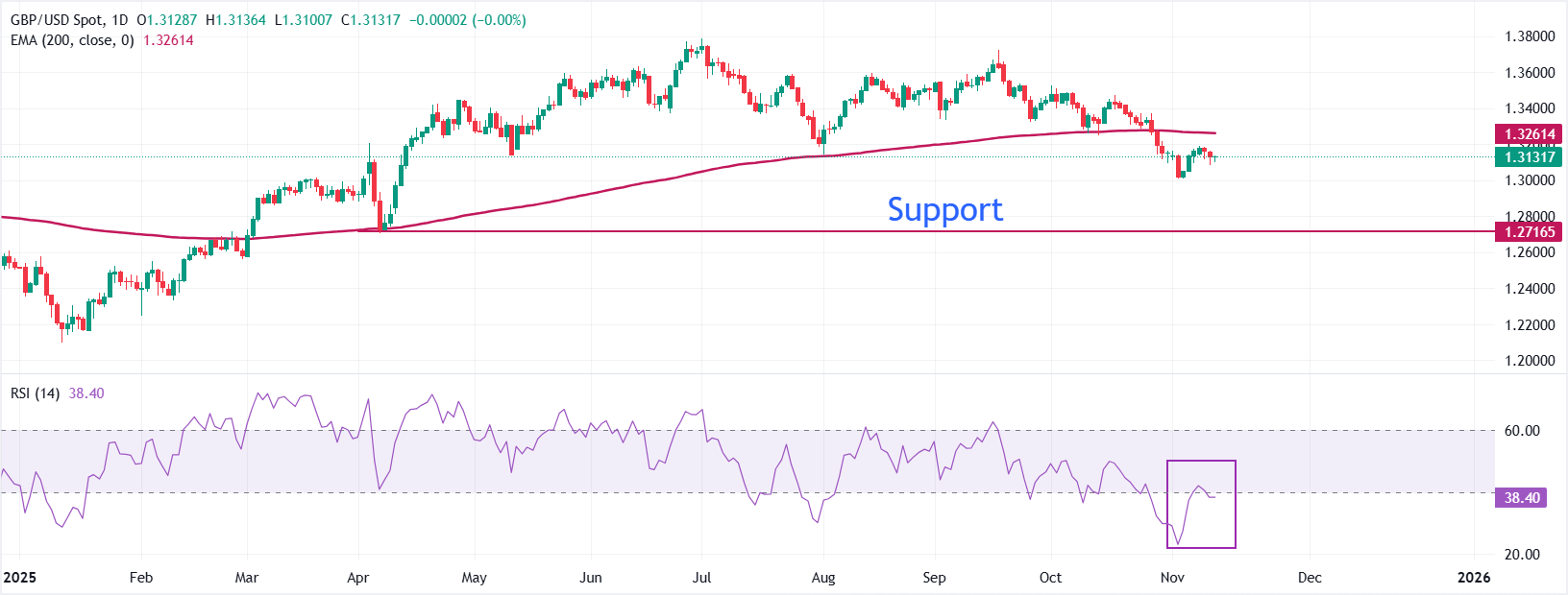 The Pound Sterling trades inside the previous day's trading range around 1.3130 against the US Dollar on Thursday. The overall trend of the pair remains bearish as it trades below the 200-day Exponential Moving Average (EMA), which is around 1.3261.