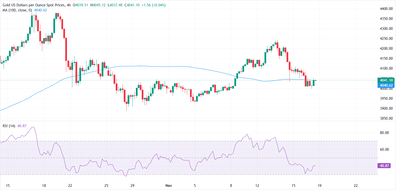 Gold's momentum remains subdued, though dip-buying continues to emerge after bulls successfully defended the $4,000 psychological support. On the upside, XAU/USD faces a confluence resistance zone near $4,050, reinforced by the 100-period Simple Moving Average (SMA) on the 4-hour chart.