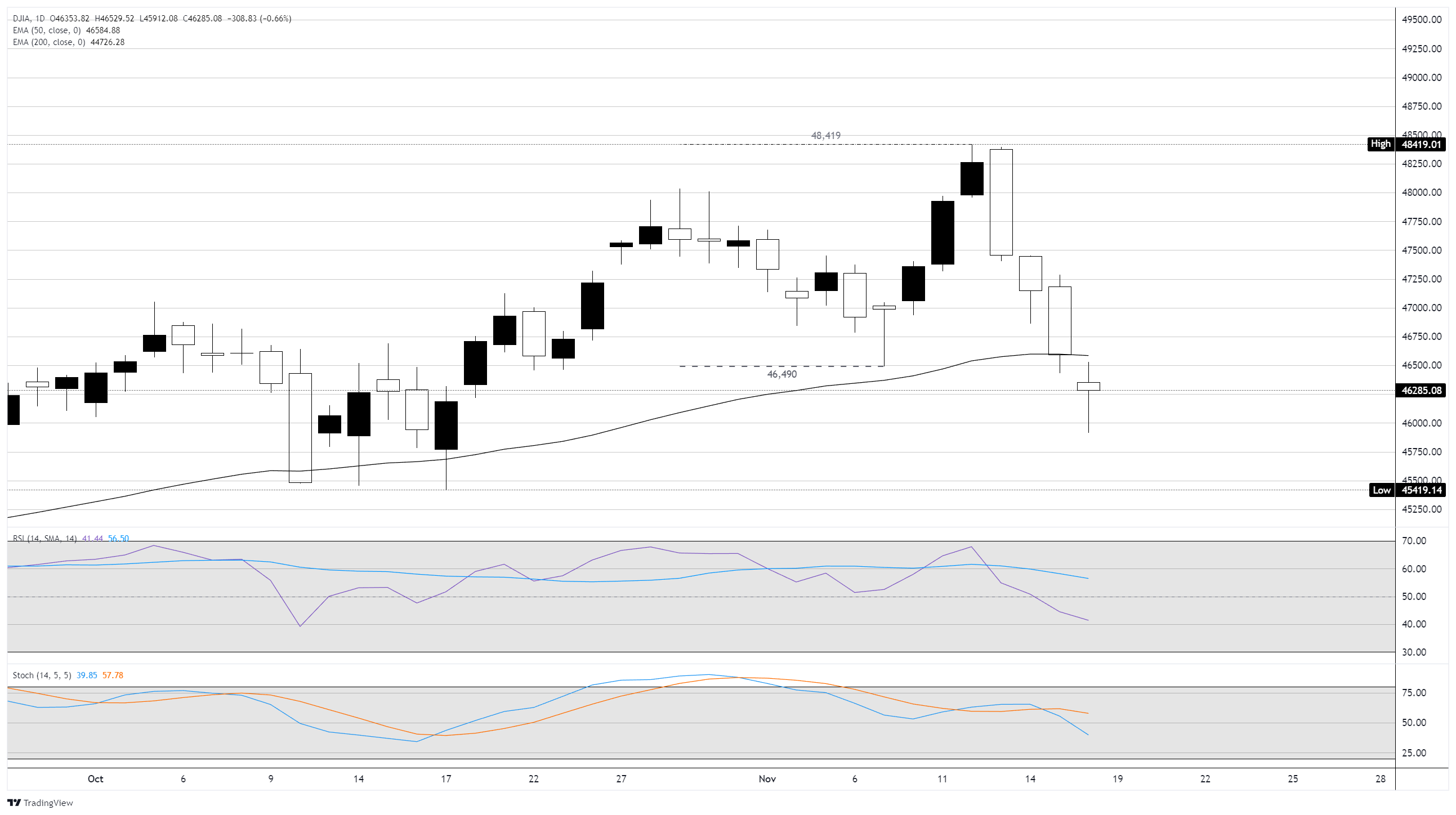 The Dow Jones Industrial Average faced renewed downside pressure on Tuesday, tumbling 680 points from the previous day's close at its lowest before finding a half-hearted technical floor near 46,255. The major equity index has pushed into a fourth consecutive bearish day as investors face headwinds on multiple fronts.