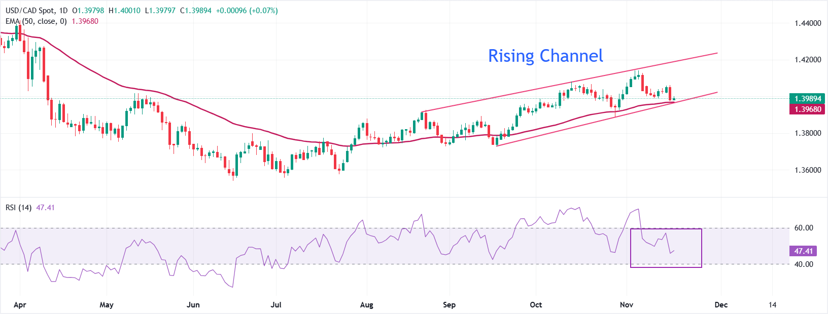 USD/CAD corrects to near the 50-day Exponential Moving Average (EMA), which trades around 1.3968. The overall trend of the pair remains bullish as it trades inside the Rising Channel formation.