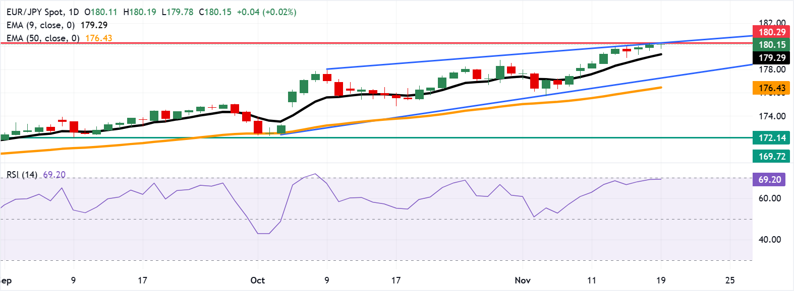 EUR/JPY moves little after two days of gains, maintaining its position around 180.20, near a fresh all-time high of 180.29, during the early European hours on Wednesday. The currency cross remains close to the upper resistance of an ascending channel pattern, suggesting that bullish momentum may be losing steam and a pullback could be on the horizon.