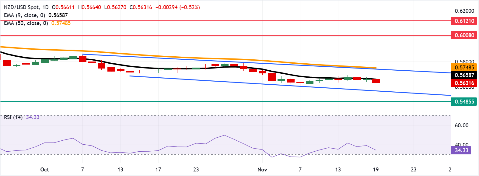 NZD/USD depreciates more than 0.5% after registering modest gains in the previous session, trading around 0.5630 during the European hours on Wednesday. The daily chart's technical analysis signals a persistent bearish bias as the pair price remains within the descending channel pattern.