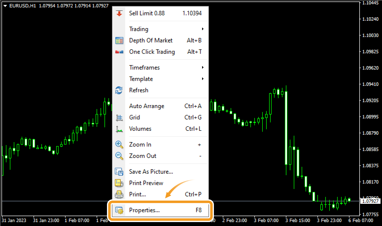 On MetaTrader4 (MT4) / MetaTrader5 (MT5), you can choose the items to display on charts from the chart properties. The items on the properties window are as follows.