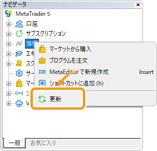 フォルダに入れたら、ナビゲータの「指標」(MetaTrader4の場合は「インディケータ」)の上で右クリックし、表示されるメニューから「更新」ボタンを選択します。