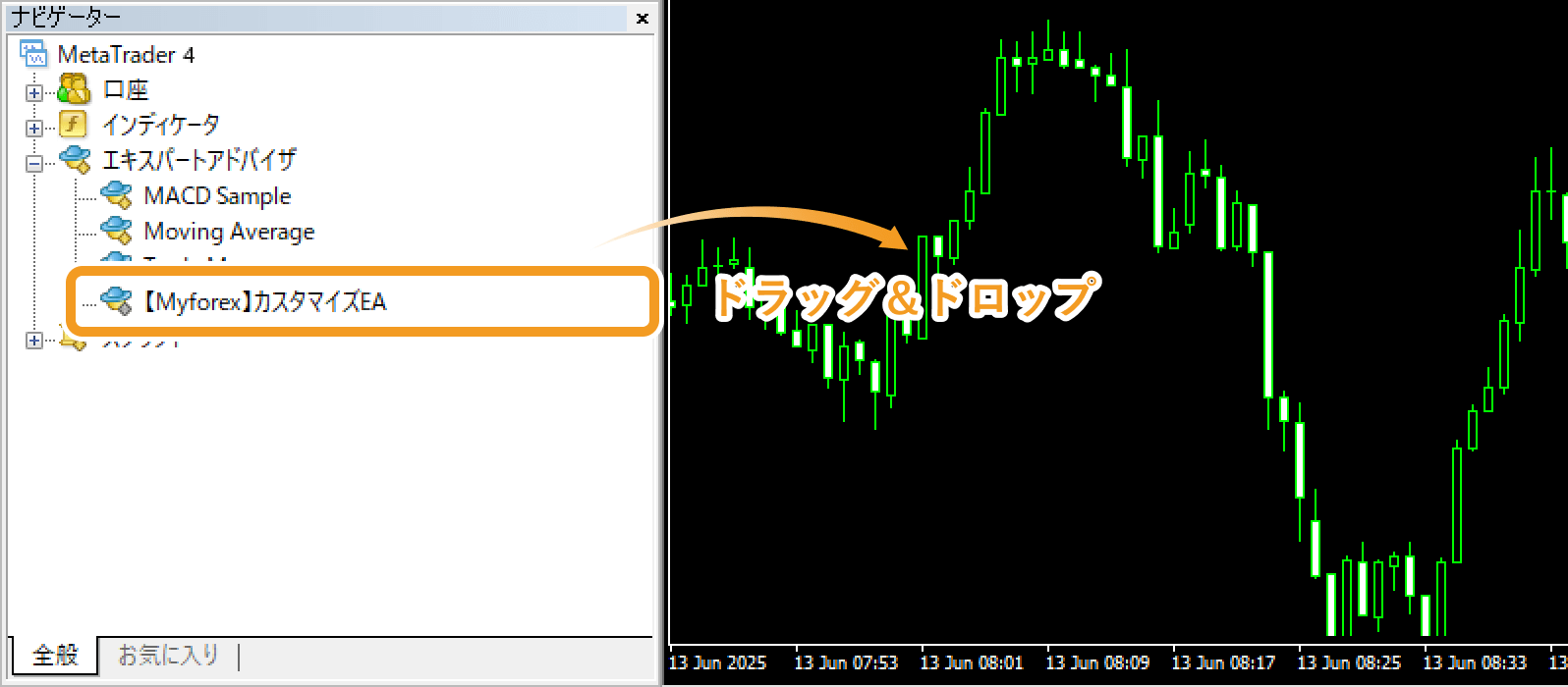 「ナビゲータ」内の「エキスパートアドバイザ(EA)」に、インストールしたEAが表示されたことを確認し、ダブルクリックまたはドラッグ&ドロップでチャートに適用します。