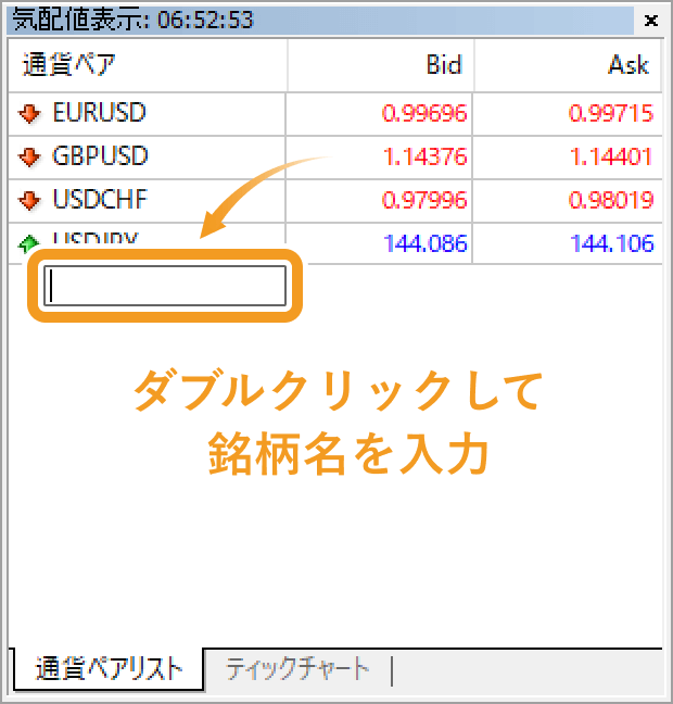銘柄名を入力して気配値表示欄に追加する場合、最も下に表示されている銘柄の1つ下に当たる部分をダブルクリックし、追加したい銘柄名を入力します。