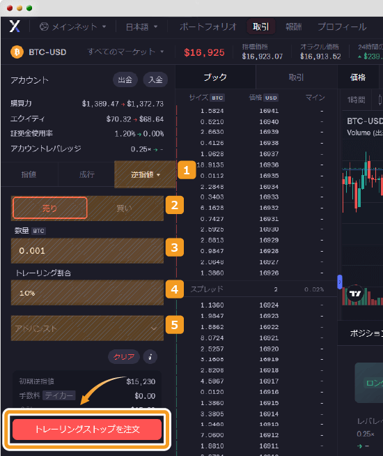 取引開始時の仮想通貨価格と損切り注文の間の価格差を%で設定します。損切り注文の位置は、仮想通貨価格に応じて変わります。 |
