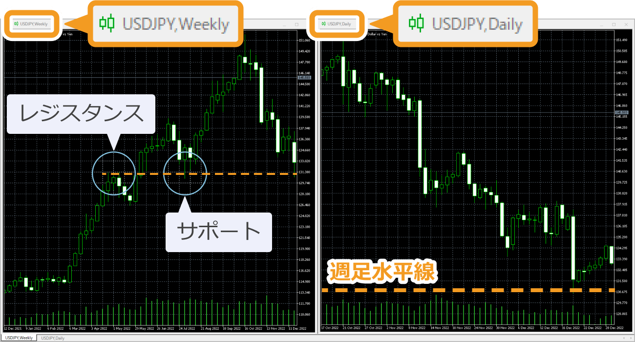 マルチタイムフレーム分析では、基本的に長期足から順に複数の時間足のチャートを分析していきます。実際のチャートをもとに、マルチタイムフレーム分析の流れを確認していきましょう。