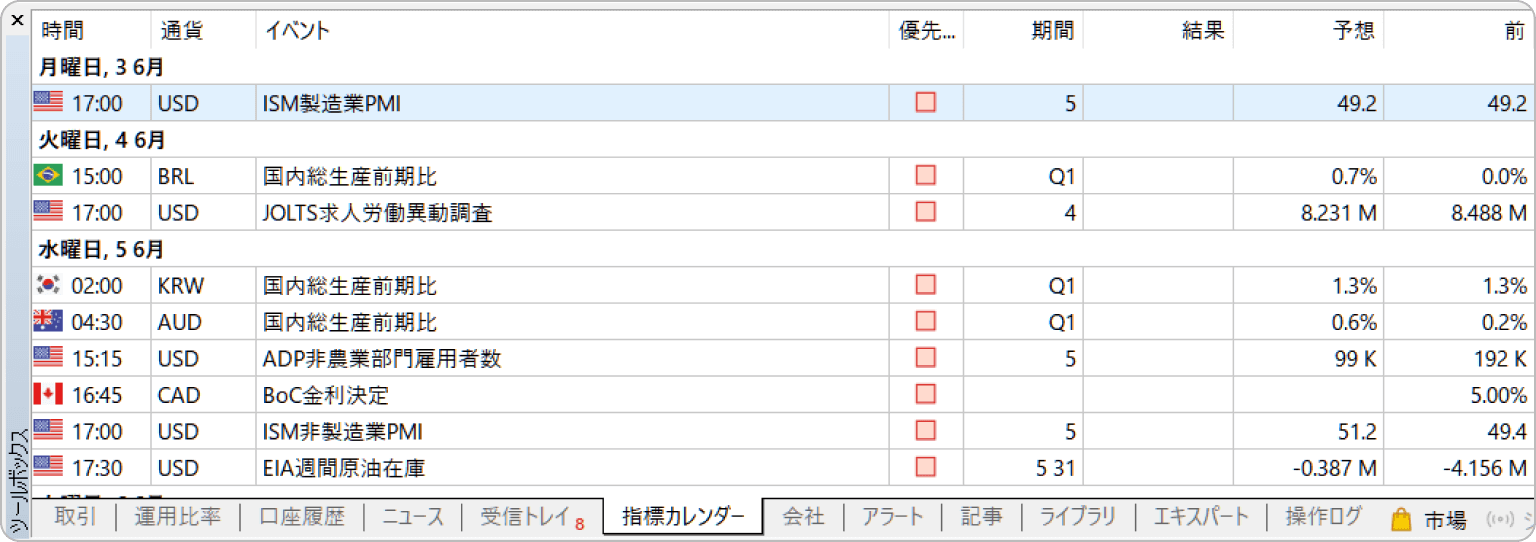 MT5では、経済指標の重要度(優先順位)や予想、結果、前回結果などを確認することができます。表示させる経済指標を優先度の高さや国名で絞り込むことも、過去の情報を表示させることも可能です。