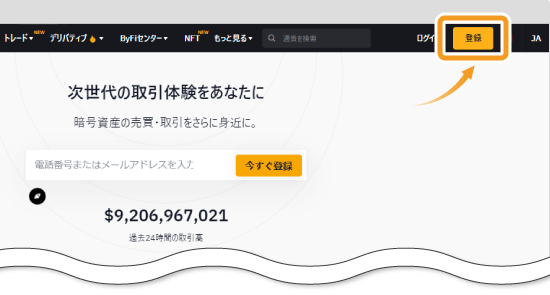 Bybitのトップぺージの右上にある「登録」をクリックします。