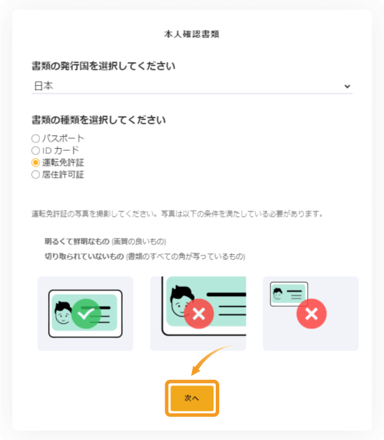アップロード方法と国籍、身分証明証の種類を選択します。選択が完了したら次へをクリックします。