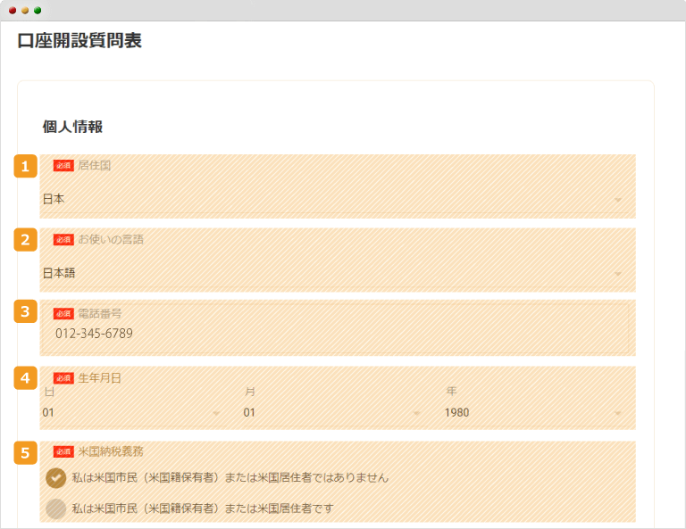 口座開設質問表の画面が表示されますので、各種情報を入力していきます。最初に個人情報の入力で、名前や住所は提出する本人確認書類・住所確認書類と一致している必要があります。