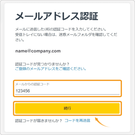 登録メールアドレスに届いた確認コードを「メールからの認証コード」に入力して、「続行」をクリックします。