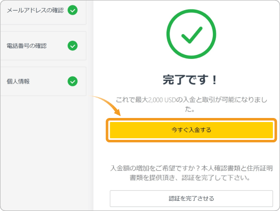 Exnessの口座開設は3つのステップに分かれており、本人確認や住所証明書類の提出前でも2,000ドルまでの入金と取引が可能です。また、本人確認書類を提出すると入金上限額が5万ドルに引き上げられます。