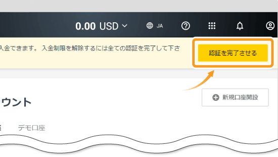 口座開設完了画面の「認証を完了させる」をクリックします。