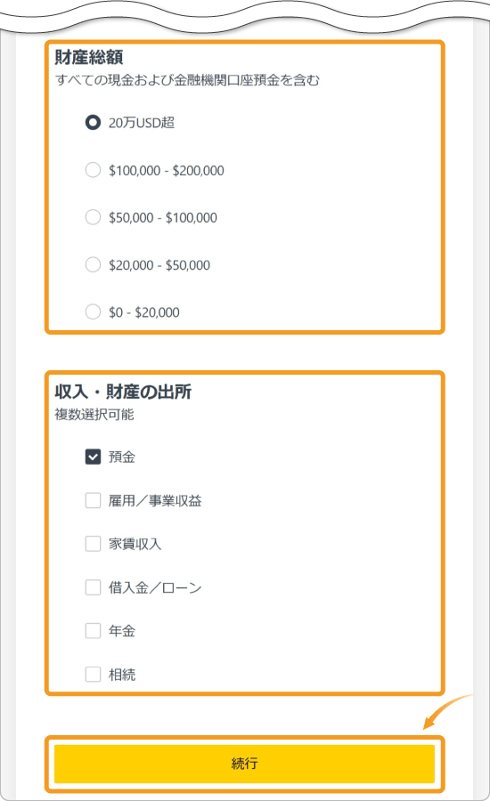 さらに画面をスクロールし、現在の金融資産、収入源についての質問に回答します。回答が終わったら、下部の「続行」をクリックしてください。