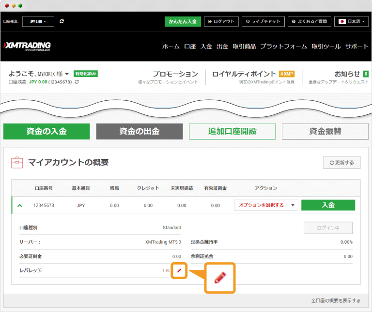 口座情報の「レバレッジ」の欄にある「赤色の鉛筆マーク」をクリックします。