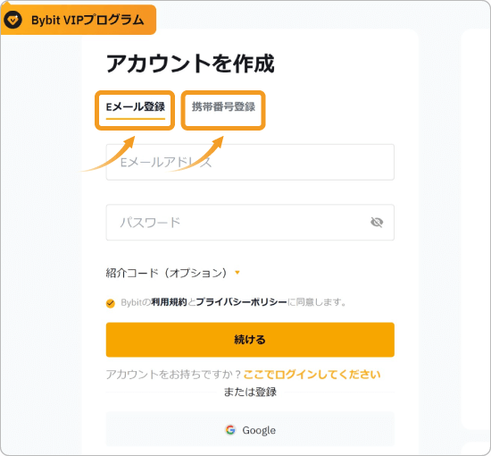 Bybit(バイビット)のデモ用のアカウントは、メールアドレス・電話番号のどちらからでも登録可能です。