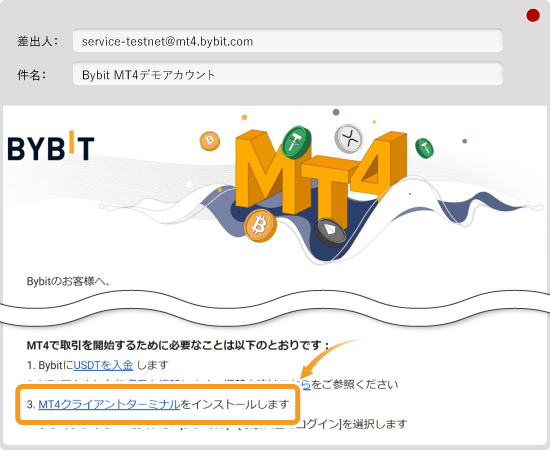 登録したメールアドレスに届いた「Bybit MT4デモアカウント」という標題のメールを開きます。そして、中段に記載されている「 MT4クライアントターミナル」をクリックします。