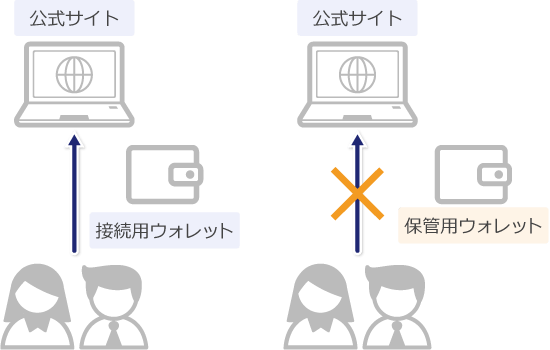 イーサリアムなどのウォレットアドレスは、複数個持つことができます。そこで、ブロックチェーンに接続しない、保管するためだけのウォレットを作っておくと安心です。こうすることで、不注意でフィッシング詐欺のサービスにウォレットを接続してしまっても、NFTを守ることができます。