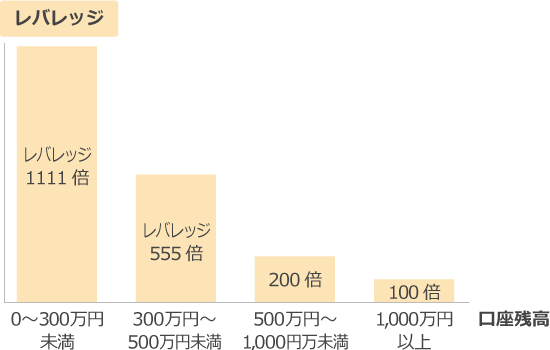 従来は200万円未満の口座残高に対し999倍のレバレッジが適用されましたが、今回のアップデートに伴い、300万円までの口座残高に対して1,111倍のレバレッジが適用される仕様に変更されました。