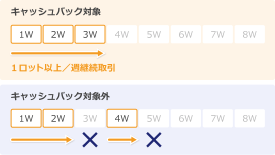 例えば、1~3週間目まで週に1ロット以上の取引を達成し、4~8週間目まで全くトレードをしなかった場合でも、「3週間連続して、1週間に1ロット以上」という条件を達成しているため、キャッシュバック対象となります。