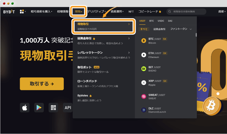 Bybit(バイビット)の現物取引の方法は以下のとおりです。