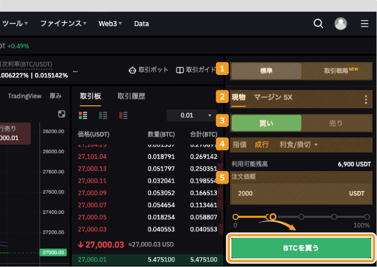 BTC/USDTのペアでBTCを購入する場合は、以下のように操作して「BTCを買う」をクリックします。