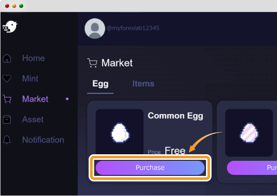 画面左側の「Market」をクリックして、購入したいエッグNFTの「Purchace」をクリックします。