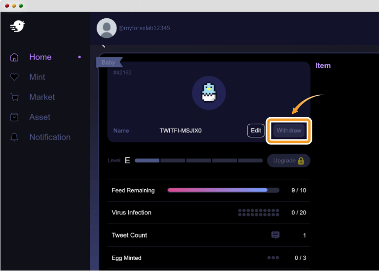 最初にエッグNFTがひとつ提供されるので、プレイヤーは無料でTwitFiを始めることができます。アプリ内のマーケットプレイス(「Market」)やOpenSea(オープンシー)でエッグNFTを購入することもできます。エッグNFTを孵化させると、バードNFTを獲得できます。