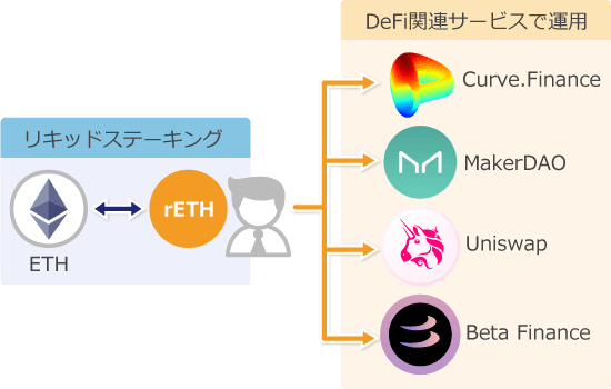 また、rETHは取引所で売却できますが、他のDeFi(分散型金融)関連サービスで運用することも可能です。rETHを運用すると、そこから利益を得られます。