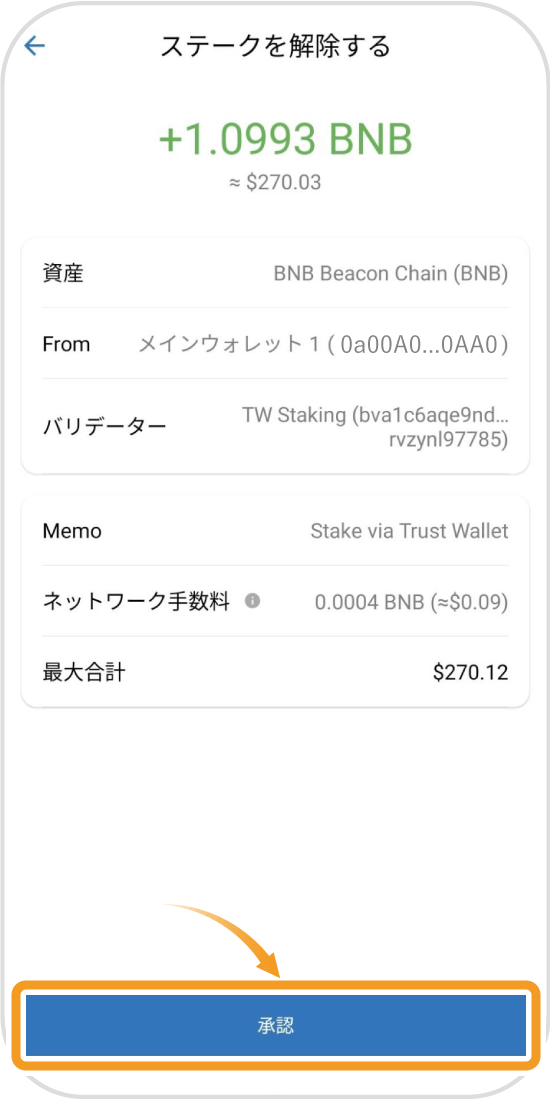 ステーキング解除の条件に問題がないかを確認します。問題がなければ「承認」をタップします。