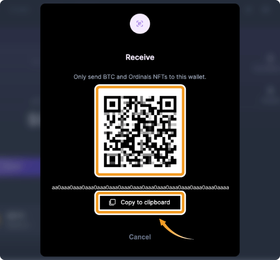 ウォレットアドレスが表示されるので、「Copy to clipboard」をクリックしてコピーします。取引所の送金画面に貼り付け、BTCを送金してください。