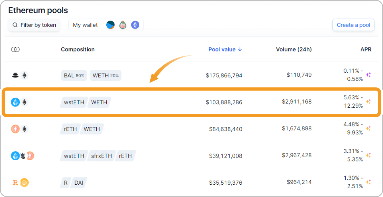 Balancerのプール一覧を見ると、流動性を提供できる仮想通貨ペアの一覧が表示されます。その中で、例としてwstETHとWETHの組み合わせをクリックします。