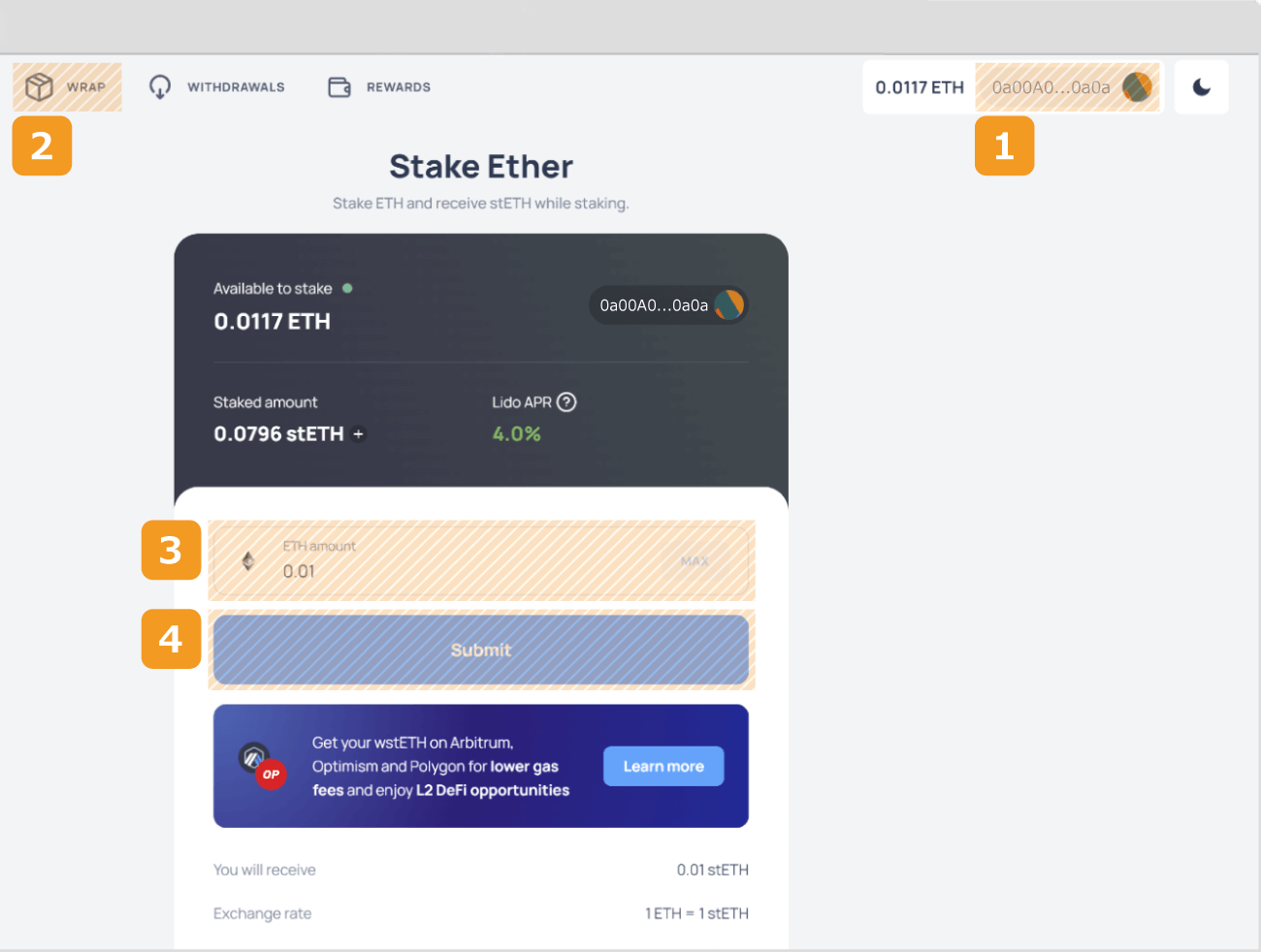ウォレットにイーサリアムを保有した状態でLido Financeのホームページに移動し、1をクリックしてウォレットを接続します。その後、2をクリックしてステーキングのページに進み、ステーキングしたい数量を3に入力して4の「Submit」をクリックします。