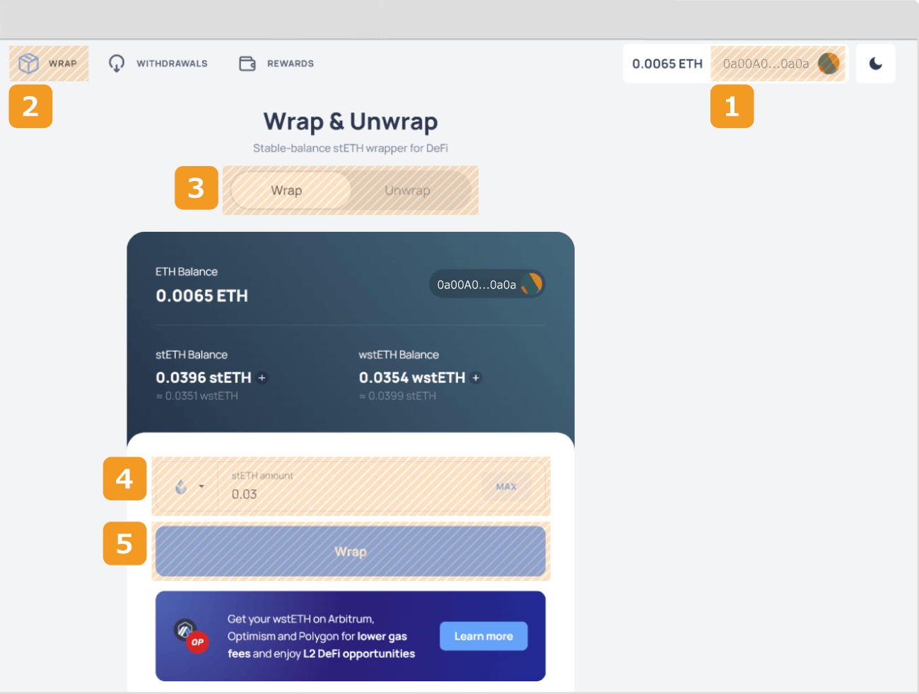 ウォレットにwstETHを保有した状態でLido Financeに移動し、1をクリックしてウォレットを接続します。その後、メニューで2のWRAPを選択してラップのページに移動します。